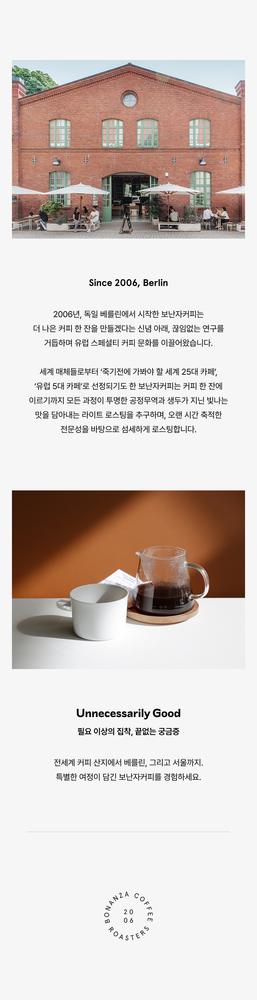 생두가 지닌 고유한 향미를 담아내기 위해 라이트 로스팅을 지향해 온 보난자커피가 선보이는 다크 로스팅 원두. 수년 간 경험을 바탕으로, 라이트 로스팅에 익숙지 않은 분들도 보다 쉽게 접근할 수 있도록 일관성 있는 맛을 구현해냈습니다. 생두의 매력을 극대화하는 보난자커피의 전통과 새로운 도전 사이, 언제든 편안하게 즐기기 좋은 브라질 커피를 만나보세요.