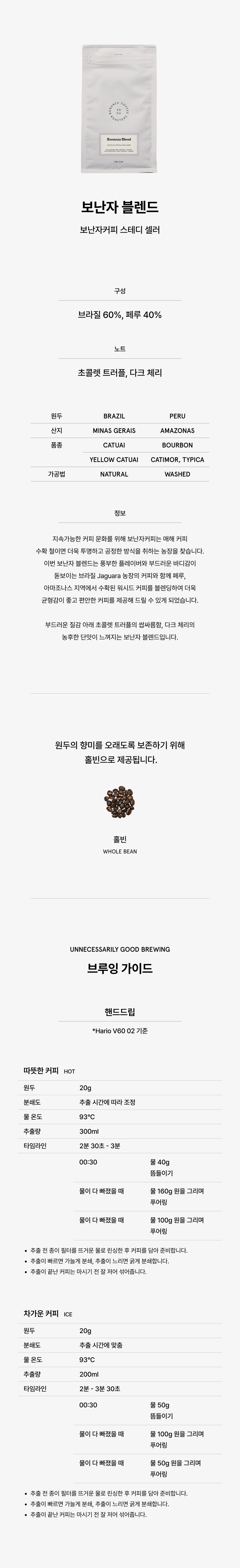 지속가능한 커피 문화를 위해 보난자커피는 매해 커피 수확 철이면 더욱 투명하고 공정한 방식을 취하는 농장을 찾습니다. 이번 보난자 블렌드는 풍부한 플레이버와 부드러운 바디감이 돋보이는 브라질 Jaguara 농장의 커피와 함께 페루, 아마조나스 지역에서 수확한 워시드 커피를 블렌딩하여 더욱 균형감이 좋은 커피를 소개해 드릴 수 있게 되었습니다. 부드러운 질감 아래 초콜렛 트러플의 쌉싸름함, 다크 체리의 농후한 단맛이 느껴지는 블렌드입니다.