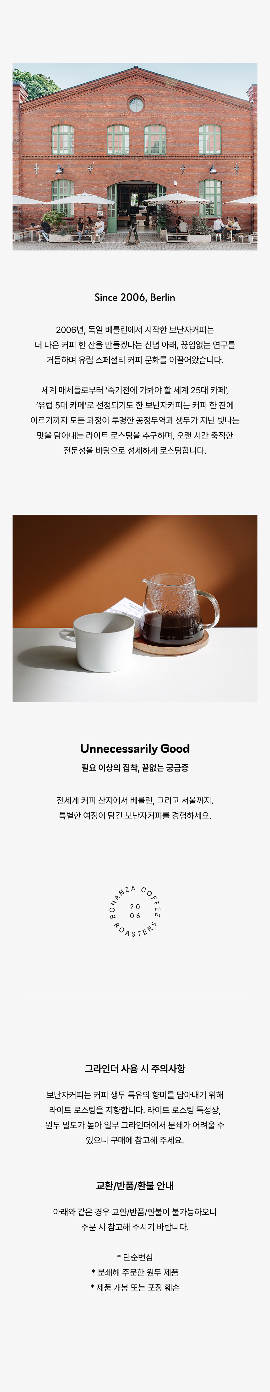 * 로스터리 확장 이전 작업으로 인해 3월 중순까지 분쇄 선택이 불가하며, 홀빈으로만 출고됩니다. 이용에 참고 부탁드립니다.