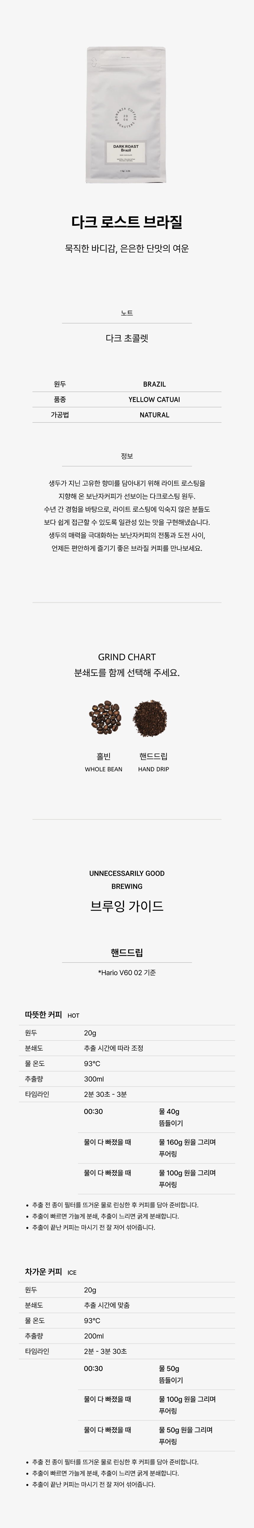 생두가 지닌 고유한 향미를 담아내기 위해 라이트 로스팅을 지향해 온 보난자커피가 선보이는 다크 로스팅 원두. 수년 간 경험을 바탕으로, 라이트 로스팅에 익숙지 않은 분들도 보다 쉽게 접근할 수 있도록 일관성 있는 맛을 구현해냈습니다. 생두의 매력을 극대화하는 보난자커피의 전통과 새로운 도전 사이, 언제든 편안하게 즐기기 좋은 브라질 커피를 만나보세요.